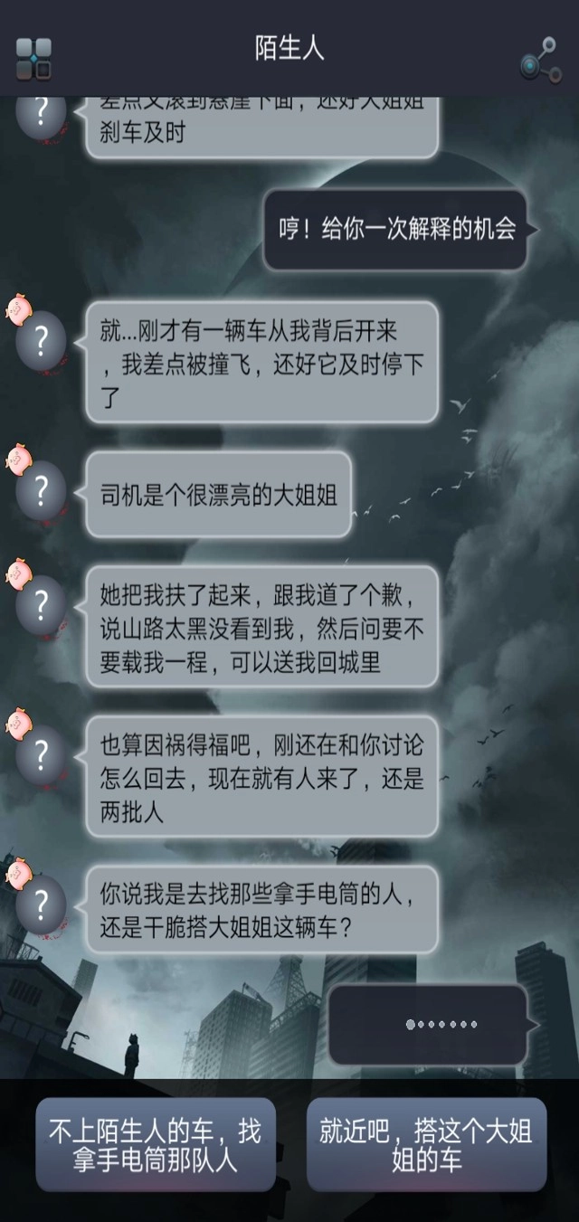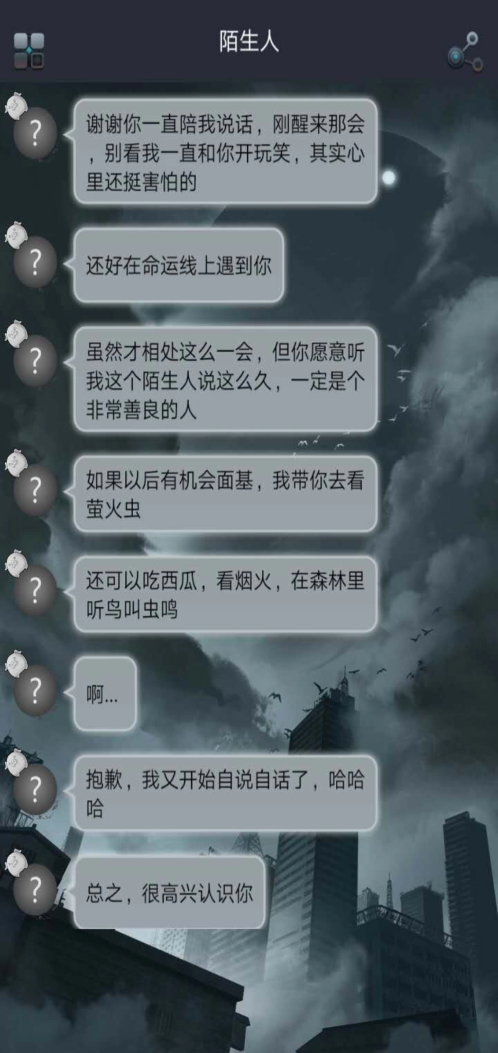 在游戏中,你将在手机上遇到一位远在天涯的陌生人,并与他进行对话交互,你可以通过下方的回答按钮推进剧情,不同的选项将会得到不同的答复,而有的回答将会导致不一样的结局!
