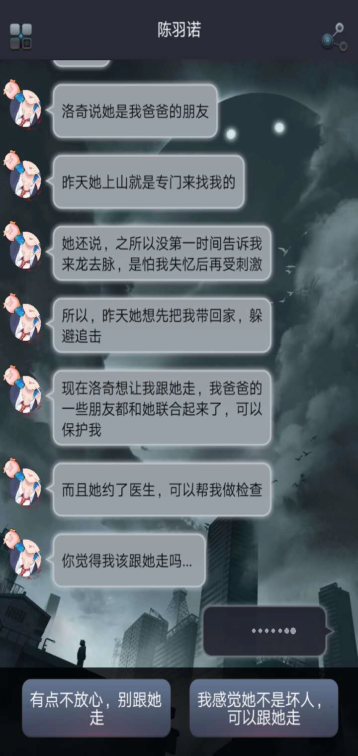 3、第二日第二篇中,在陈羽诺选择是否去医院时,选择“有点不放心,别跟他走”。(选择第二个选项后,陈羽诺会在路上遭遇不幸。失去联络)