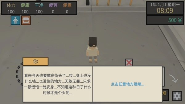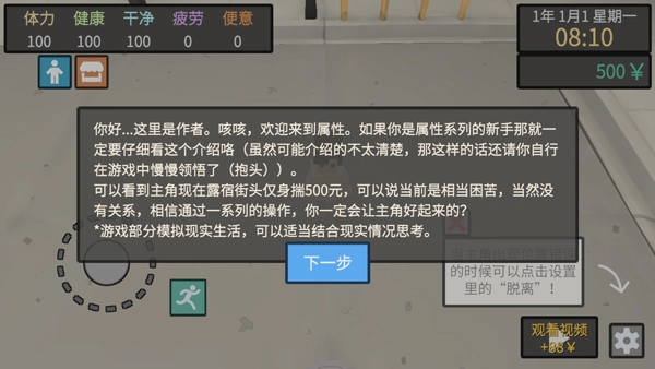 出生地可以洗澡拉粑粑至于玩泥巴乞讨的bug还没修复,你离开那个地方的时候,要记住回去时候的样,不然你就路痴了,然后到最近距离的超市兼职,兼完职到那个公园,有三个长椅,先不急,那里有个垃圾桶,翻垃圾大概率有薯片,然后你,就休息奥利给要,凑到100,方便释放一下奥利给,然后,回去,释放洗澡,然后重复那样,如果体力不够,把超市工作拉满,就再去歇一下,再工作,记住,工作只满300店员然后工作只满1500去餐厅然后反反复复。
