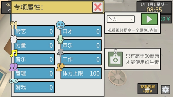 然后就是窝在家,干一个小时的哑铃(一定要一个小时,少了不加体力上限),最后看数值变化。