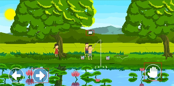 2、选择帮大宇钓鱼后继续向右移动到鱼竿处,在鱼竿上方出现对话图标后,点击右下角手印开始钓鱼。