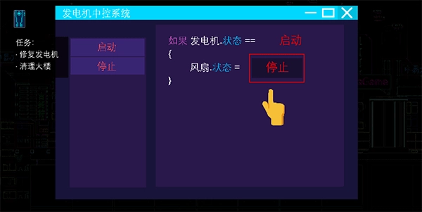 6、在楼顶场景接完老板的电话后向左移动去维修发电机,走到冒烟的发电机附近后,点击左上角的骇客图标,然后点击右下角按钮接入发电机系统,修改代码为“发电机启动,风扇启动”后即可成功。