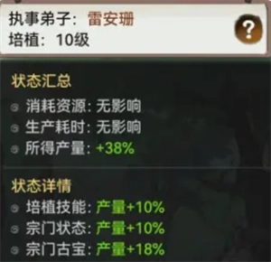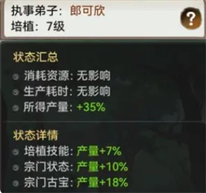 下面以两位不同培植等级(一个7级,一个10级)的执事弟子对比,培植技能差了3个等级,同样是在林场工作,相同时间将拉开3%的产量差距哦~