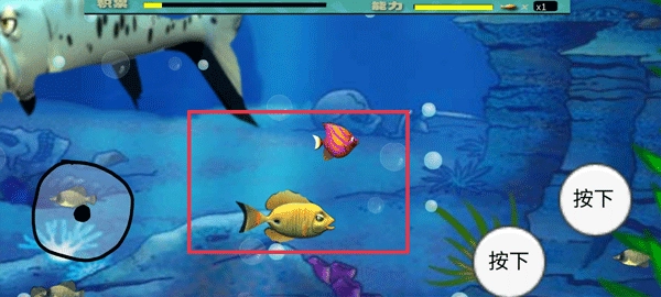 3、利用触屏来控制小鱼游动,在游动过程里,要是碰到体型比自己小的鱼,就能将对方吃掉。