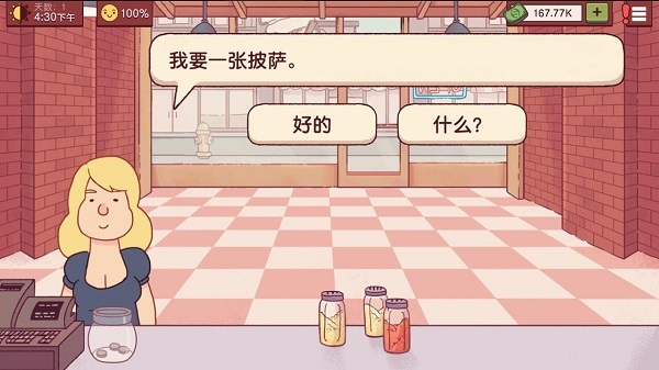 5、30多天之后,攒了钱先买自动切披萨助手(当然了其他配料可以买的话当然先买齐配料啊),用了其他配菜助手之后,每天开销会很大,一天挣不了100了,但可以解放双手,请考虑选择,我不建议买,只买了酱料助手就有点后悔,请务必保证自己剩余的钱大于100块(我反正少了就很不安啊),49天会有虫灾,有人帮你驱虫扣除30块(心痛),后期好像只要你没做错没少放多放东西,心情值不好也会给小费,nice