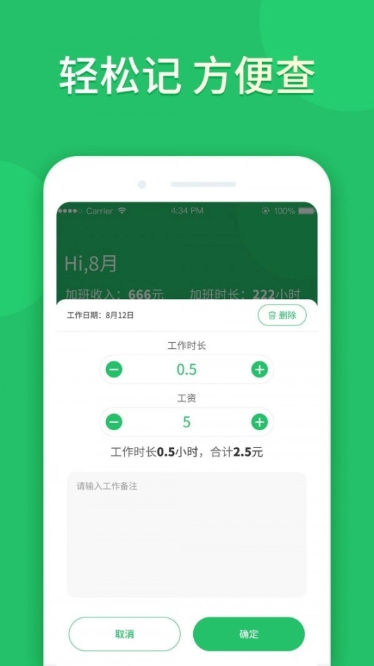 记录加班时间后,记加班让您8秒摆脱纸笔。全智能加班记录统计,为您的财富列个清单。