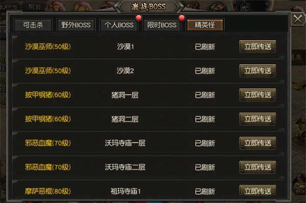 5、BOSS相关:对于具备条件的玩家要特别注意,战神在游戏里极为重要。在游戏前期,能够借助战神去刷各类BOSS 。具体操作是先让自己的战神去吸引BOSS的仇恨,待BOSS的仇恨完全集中在战神身上后,玩家再与战神配合一同刷BOSS 。尤其是道士职业,可利用施毒技能持续给BOSS上毒,运气佳的话,有机会爆出4 - 8转的装备。