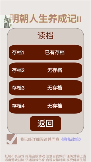 健康值、心情值随时间降低,没有存粮会导致玩家和所有家庭成员的健康值光速下降,健康值、心情值降为零,这是99.0%的死因,一般玩到弃游第一条命的寿命不会耗尽,没钱只会在缴税后显示负数,不会死档,及时到街市的医馆恢复健康,到戏院恢复心情。