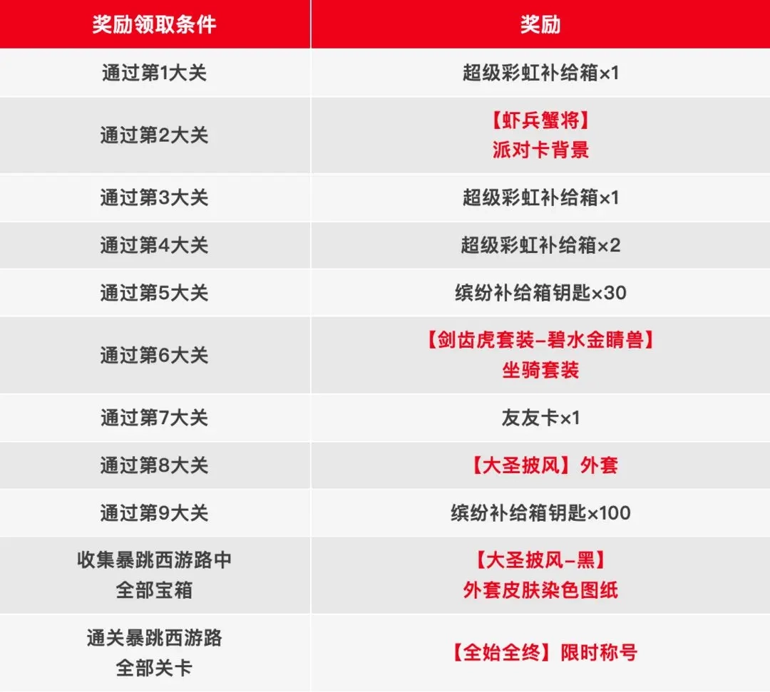 当肠肠通过「暴跳西游路」中的大关后,即可领取对应的通关奖励!不仅可以获得超级彩虹补给箱、缤纷补给箱钥匙等奖励,还可以获得【大圣披风】外套等皮肤奖励!
