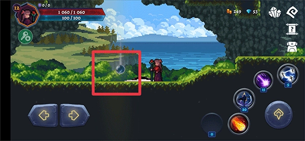 1、进入游戏后,利用左下角左右按钮操控角色的移动,右边向上按钮为跳跃,其他按钮分别为角色的技能