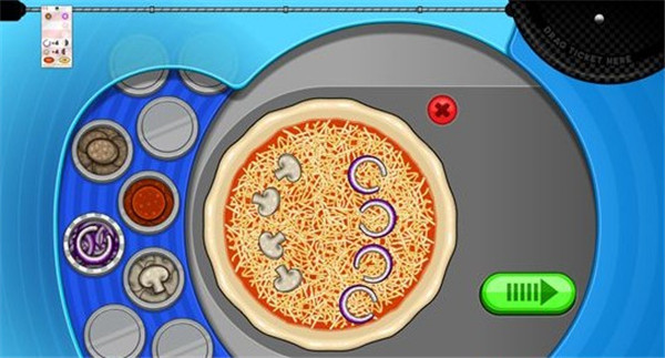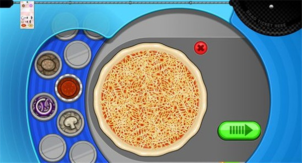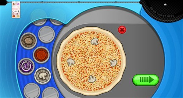 所以大家在点击披萨的时候,要根据配料的位置来合理放置,放好配料后,点击绿色箭头即可进行烘焙了。