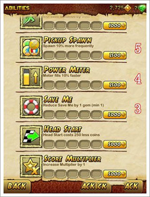 Coin Values(金币价值) :减少遇到蓝色和红色高级金币奔跑的距离。 总共有5个等级可以提升,每次提升能增加随机出现道具的能力。