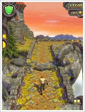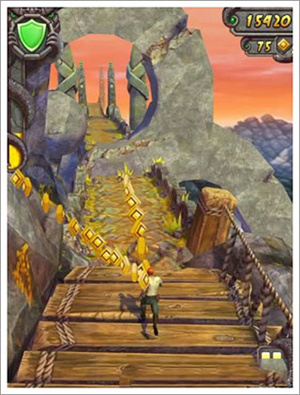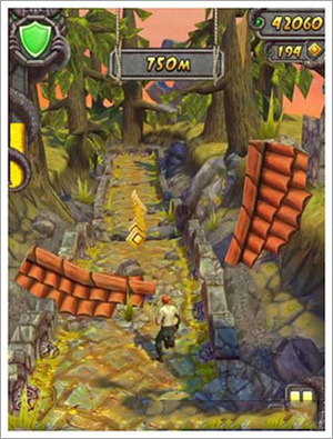 在加速状态时,可以不做任何操作,角色会自动穿越树根、陷阱、弯道、窄道等各类障碍和陷阱,而且速度非常快,可以利用重力感应操作收集相应金币,还能将怪物远远抛在后面。