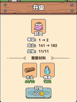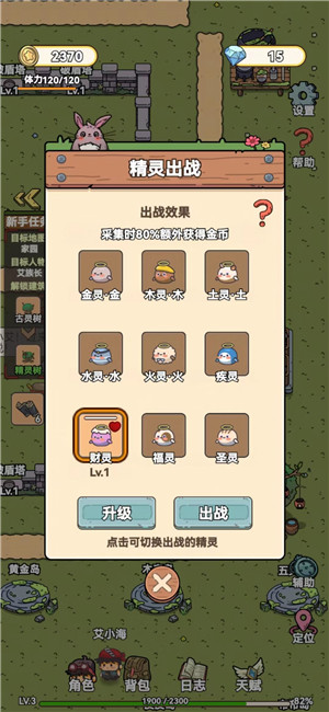 7.精灵打怪经验满了,需要去精灵树手动升级。在精灵树,打开出战界面,选择要升级的精灵,再打开升级界面就能升级。经过测试,只要带着精灵,有怪物死亡,精灵就能涨经验。这样其实就可以去野外地图带宝宝刷刷经验了。