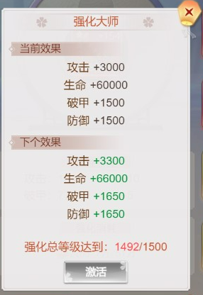 3.强化页面中,右上角的“强化大师”,根据强化总等级提供属性加成,强化总等级达到要求后即可提升属性加成效果