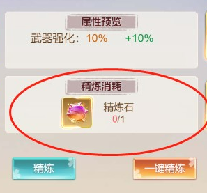 1.精炼需要消耗精炼石,精炼消耗显示的是单件的强化消耗精炼数量,一键强化则是10件装备同时强化,消耗所需的精炼石会随着强化等级的提升而提升