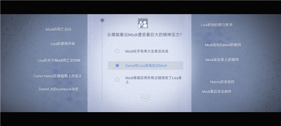 19. 完成收集后,点击右上角的“推理”,在第二个推理中依次选择【Lisa骚扰Modi】—【两个都是】—【面临破产】。
