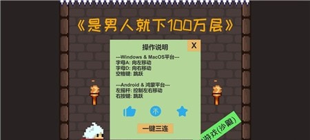 《是男人就下100万层》是一款全新的像素风冒险闯关休闲游戏。在游戏里,有着丰富多样的挑战关卡,凭借矫健的身手,你能不断躲开更多危险,顺利进入上一层,如此才能通关。整个游戏过程刺激又精彩。