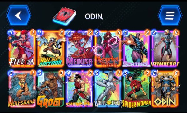 中文卡表包含:艾丽卡、火箭浣熊、美杜莎、猩红女巫、哨兵、铁心、狼毒、格鲁特、尚气、白虎、蜘蛛女、奥丁