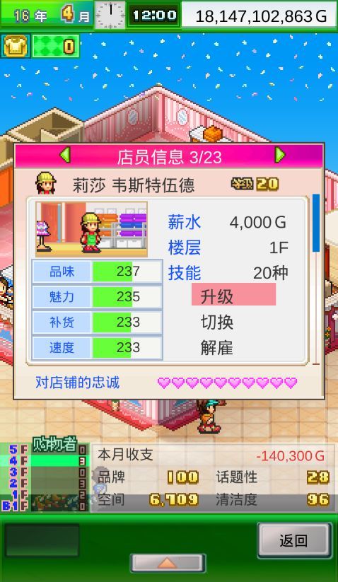 培养店员工作能力,提升店员各项能力值,升级解锁店员新技能,吸引顾客到访,提高店铺的营收和受欢迎程度~