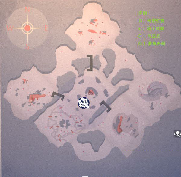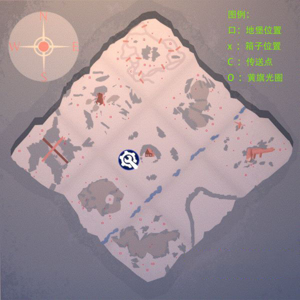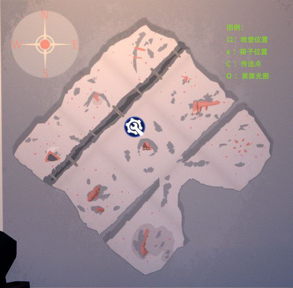 这张图是6张图中最穷的一张图,整个地图周边只有5个地方有地形,WN,NE和S都是只有一个地堡,没有任何箱子,在WN和NE炸桥点的附近还有三狼(WN三白狼,NE三黑狼),打野挖宝的时候一不留神就容易白给。