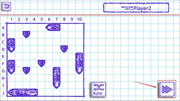 3、接下来便进入一号玩家的布阵阶段。在此阶段,点击“Auto”按钮,即可一键随机布阵。布阵结束后,点击右下角的【下一步】图标。
