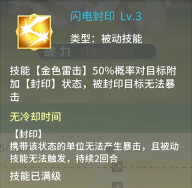 技能[金色雷击] 50%概率对目标附加[封印]状态,被封印目标无法暴击
