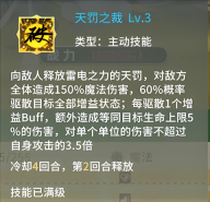 向天罚赋予雷电之力并向敌人释放,此技能会对敌方全体造成150%的魔法伤害,且有60%的几率将目标所有增益状态驱散;每当成功驱散1个增益Buff时,会额外造成等同于目标生命上限5%的伤害,不过对单个单位造成的伤害不会超过[这里应该还有具体伤害上限数值,原文本缺失] 。