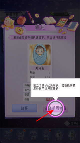 2、点准备抓周物品按钮,可开启家族成员的抓周仪式,这是影响家族成员发展的核心操作,操作时需选择合适的抓周物品。