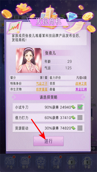 4、点进行按钮,可执行商机策略如小试牛刀,这是获取家族资源的关键策略,需根据策略的成功率和收益选择合适的方案。