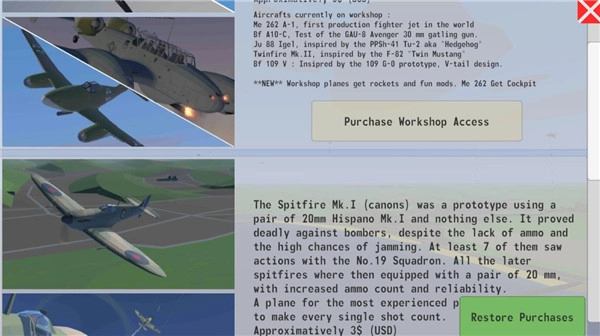 1、丰富的战斗机库:解锁40多架经典战斗机,如喷火战斗机、飓风战斗机和Ju 87战斗机,每架飞机的性能差异很大。