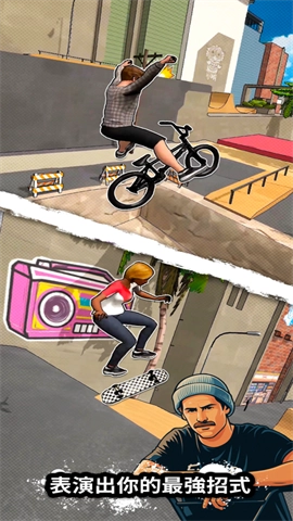 游戏内设有BMX(小轮车)、滑板和跑酷三种核心运动类型。每种运动都有独立的动作系统和控制逻辑,玩家可以选择喜欢的项目深入练习,或是交替挑战以提升综合技能。