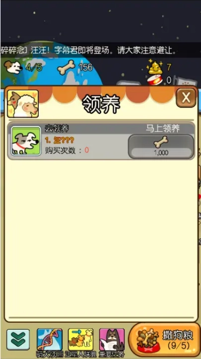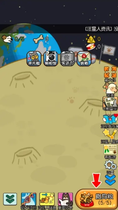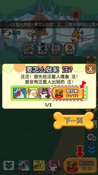 萌犬家族游戏首先通过撒狗粮的形式对汪星人进行喂食,汪!汪!汪!就会有汪星人出现。待汪星人出现之后将相同的汪星人组合合体,就能形成在此基础上的新一代汪星人。