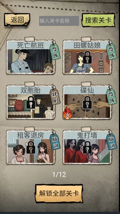 2、点击进入关卡界面通过屏幕上显示出来的:死亡航班、双胞胎、租客退房、田螺姑娘、碟仙、鬼打墙、躲猫猫、深夜外卖、爷爷是鬼王、水里的美人、最美的女人等等来进行选择想要的闯关挑战。
