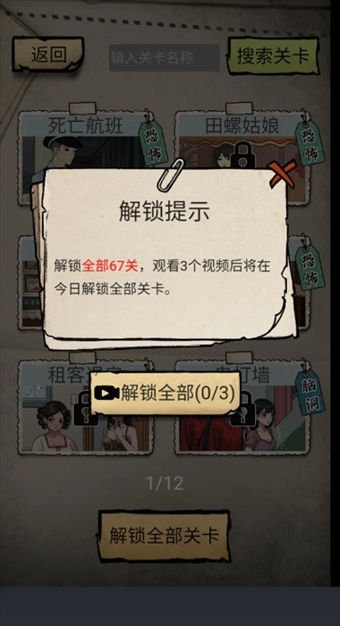 3、在关卡闯关中有些是没有解锁的需要通过解锁提示:解锁全部67关,观看3个视频后将在今日解锁全部关卡。