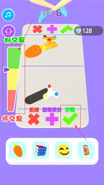 2、根据“好交易”进度,决定点【拒绝】(×)、【想要更多】(+)或【交易】(√),使进度匹配后点【交易】。