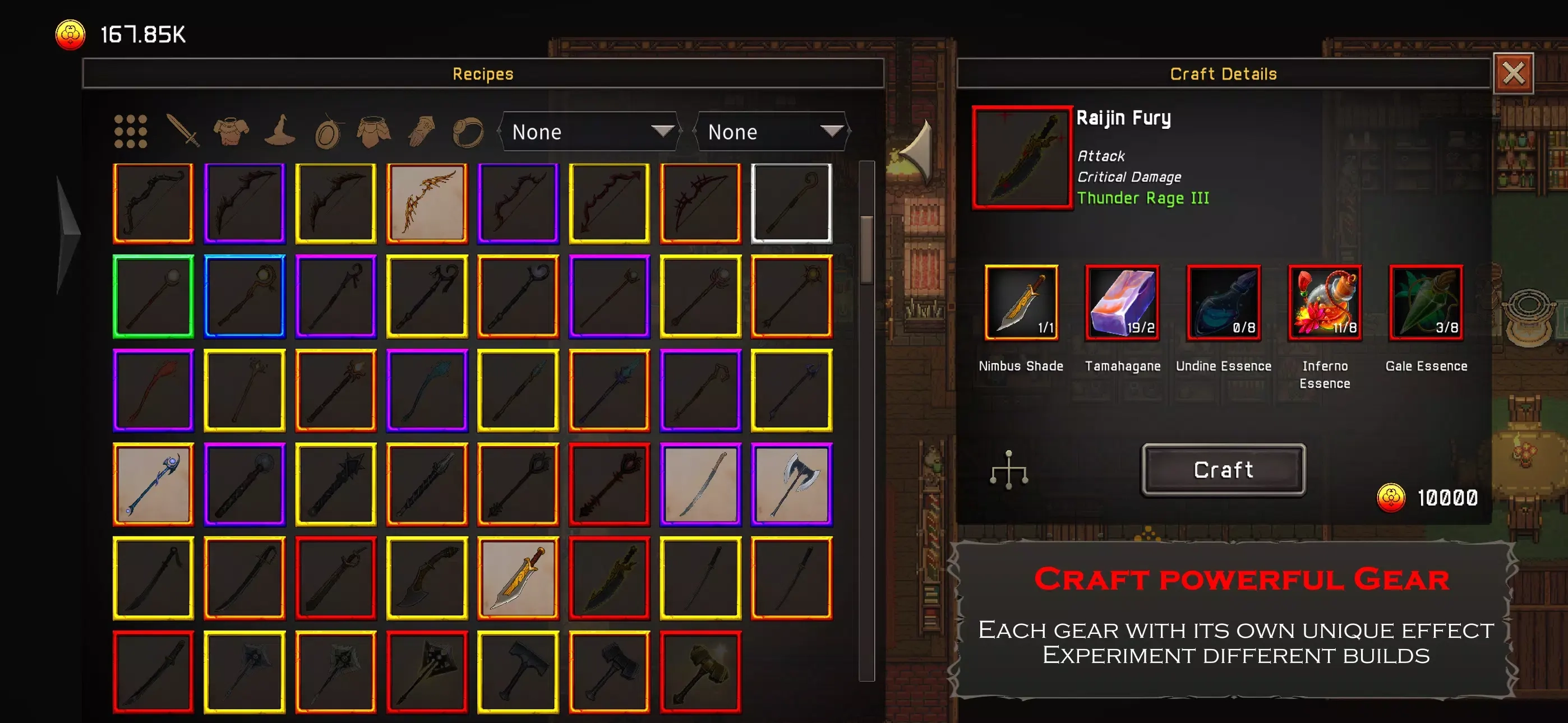 3、在冒险中收集材料,可以在铁匠铺打造极具个性化的武器、盔甲和神器,全面提升角色实力。