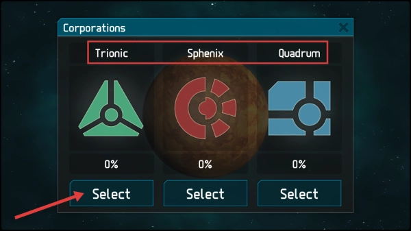 2、在势力选择界面,可选择【Trionic】【Sphenix】或【Quadrum】三大阵营,点击对应【Select】按钮确认选择。