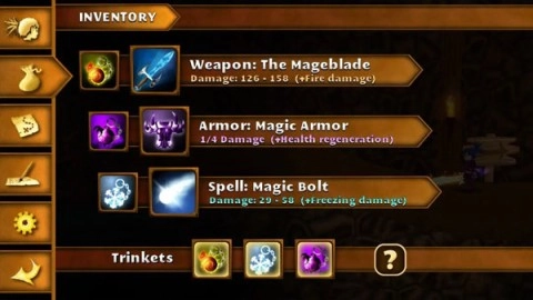 2、这是装备面板,由“武器”“盔甲”“法术”三部分构成,通过元素附魔能够增强攻击效果。