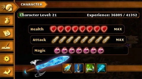1、这是人物属性面板,第一条是 HP 上限,第二条为攻击力,第三条为 MP 上限,下方四个空格是传说之剑的碎片,游戏后期可以收集到完整。