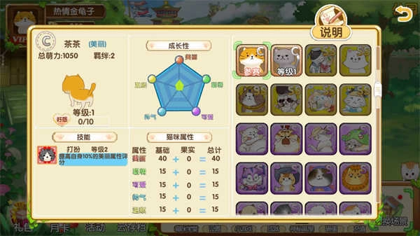 2 技能评分:喵咪学习技能后会自动发动技能效果,影响评分。注:SS级喵咪拥有最强力的技能哦