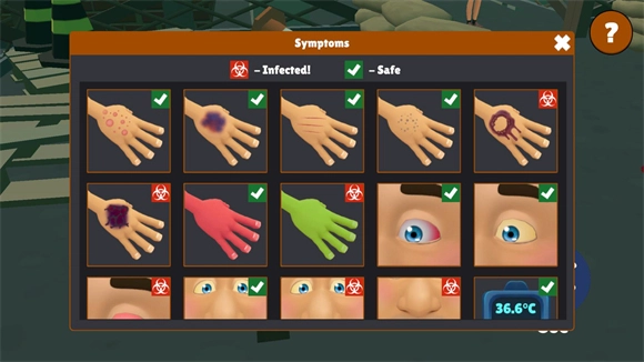 2、点击右上角的问号按钮可以查看被感染的症状,可以利用这些来判断被丧尸感染的人。