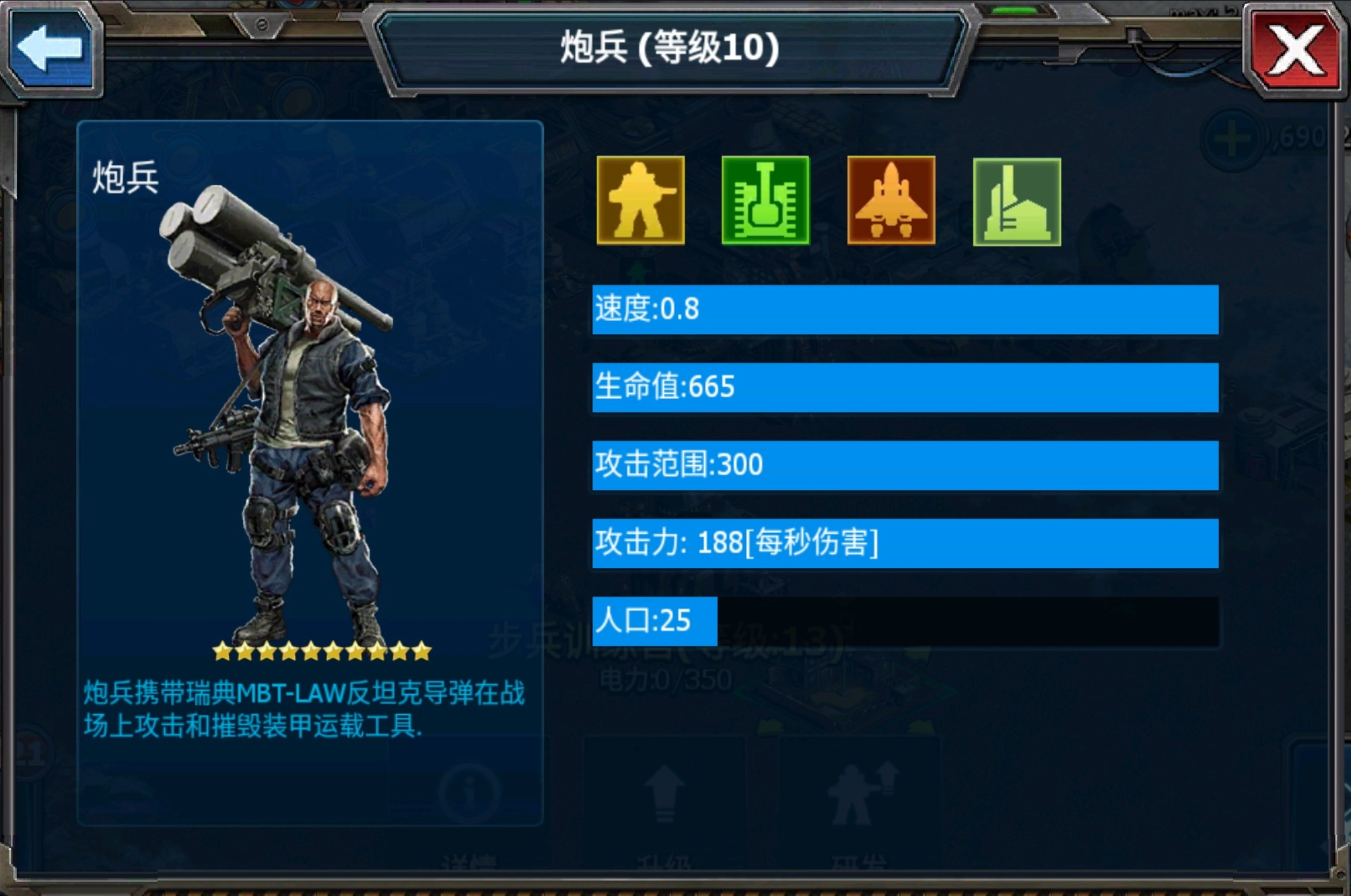 只推荐升级的四个科技是:1步兵,2轻型履带车,3夜莺直升机,4所有类型的防御塔。