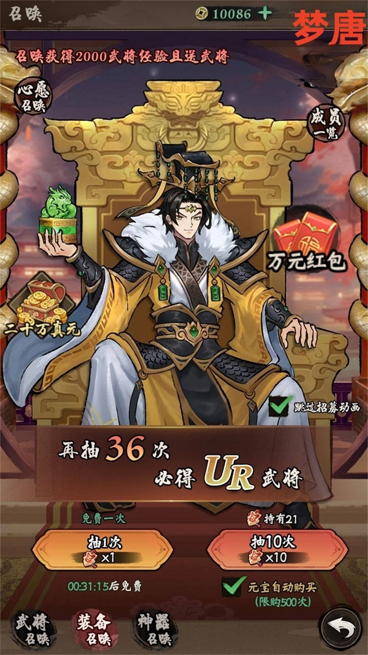 3、福利党前期可在游戏里练吕布;小氪玩家前期推荐从SSR里选关羽、孙尚香这类核心武将培养;大佬则能直接开局搭配满配阵容。更多阵容搭配和培养建议,大家可以多在世界频道交流探讨。另外,召唤殿活动中建议优先招募,这样更容易获得高级、极品、至尊等优质武将,性价比也更高。