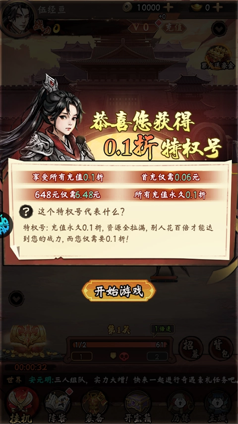 1、进入游戏即可领取0.1折特权