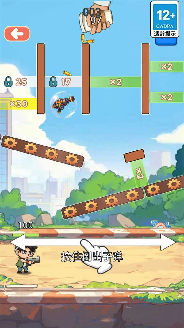 1、玩家借助触屏或其他操控手段,来把控子弹的方向与速度。