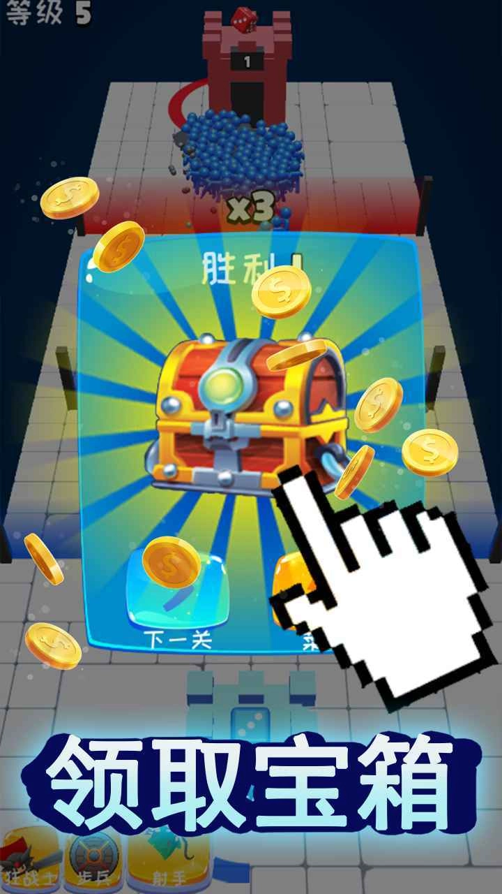 1、游戏里的关卡设计十分精彩,只需滑动屏幕就能投掷骰子,进而生成相应数量的士兵。