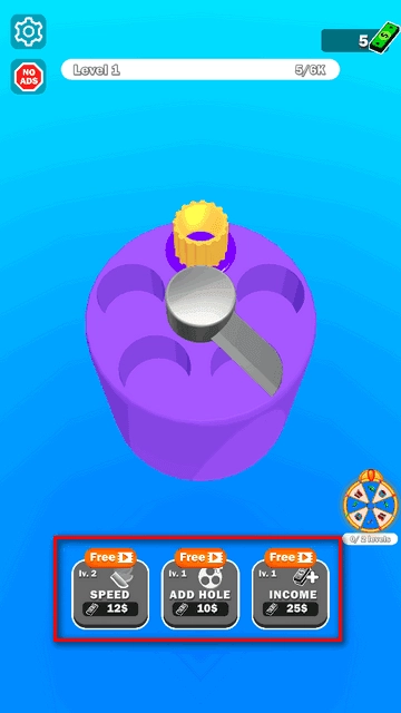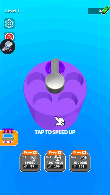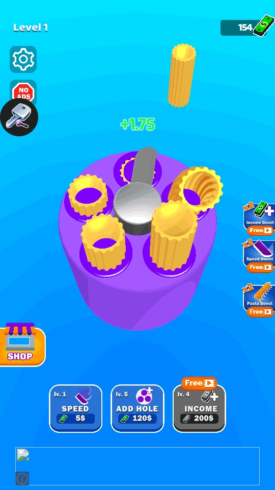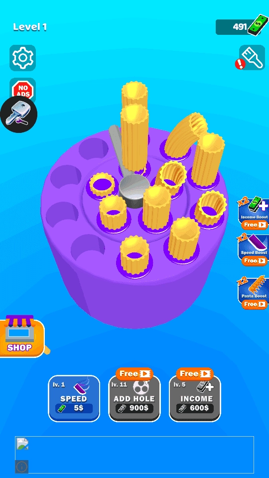 2、通过赚取收益来提升切割效率,解锁更多面条孔洞以及加快收益获取的速度。