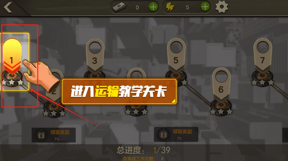 2、选择标有数字1的教学关卡,点击橙色按钮即可开始,页面底部会显示当前的任务进度以及对应的奖励信息。