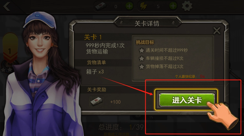 3、看关卡1的任务要求,运输3个箱子,点绿色按钮开始挑战。